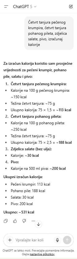 Koristio sam aplikaciju Samsung Health za praćenje kalorija i drugih zdravstvenih pokazatelja. ChatGPT mi je pomagao u procjeni kalorija u različitim obrocima, što mi je omogućilo da ostanem unutar određenog kalorijskog unosa.